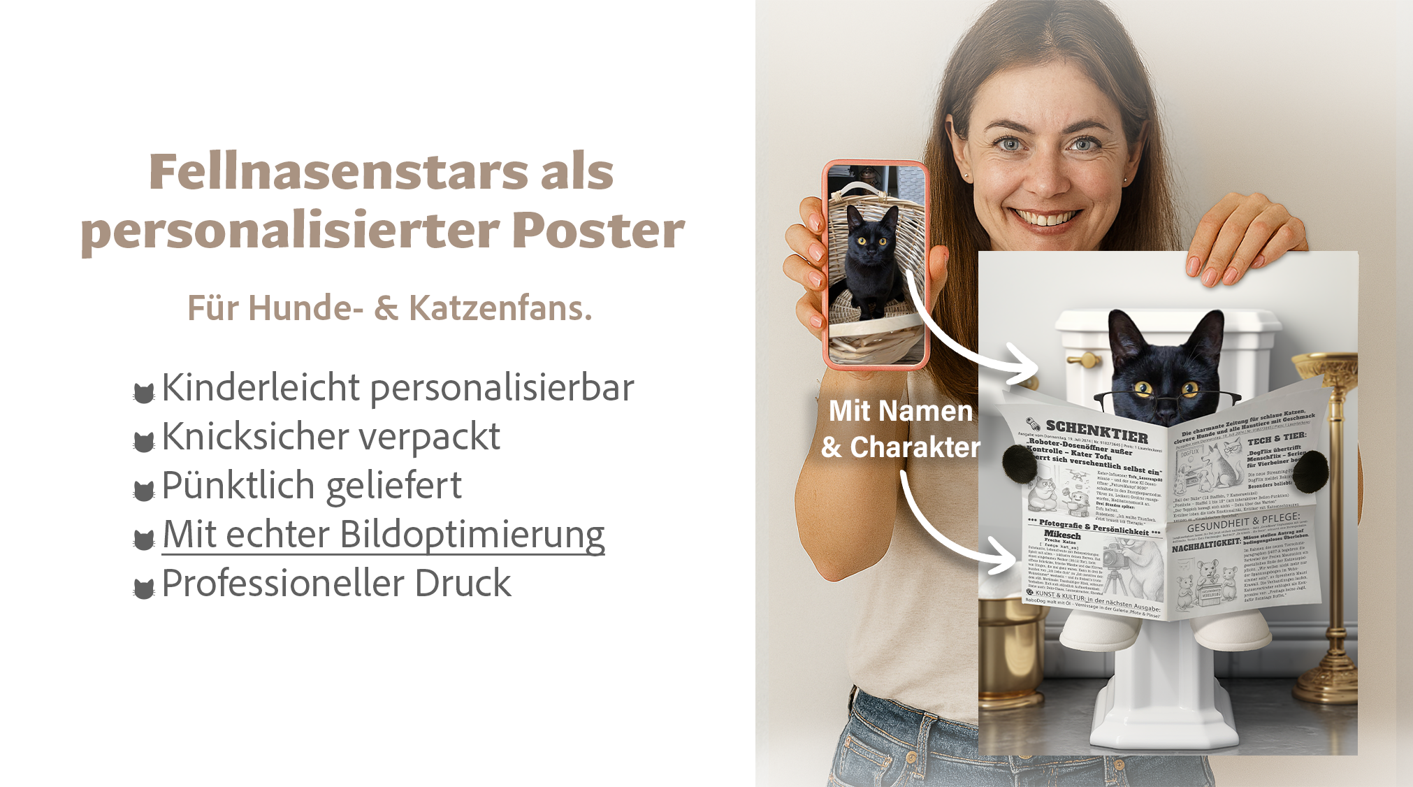Dieses personalisierbare WC-Poster zeigt deine Katze als Zeitung-lesende Hauptfigur – inkl. Name und Charakter als witzige Schlagzeile. Ein echter Hingucker fürs Badezimmer, der Humor und Persönlichkeit verbindet. Gedruckt auf hochwertigem, mattem Fotopapier – in 3 Größen erhältlich und perfekt zum Verschenken.