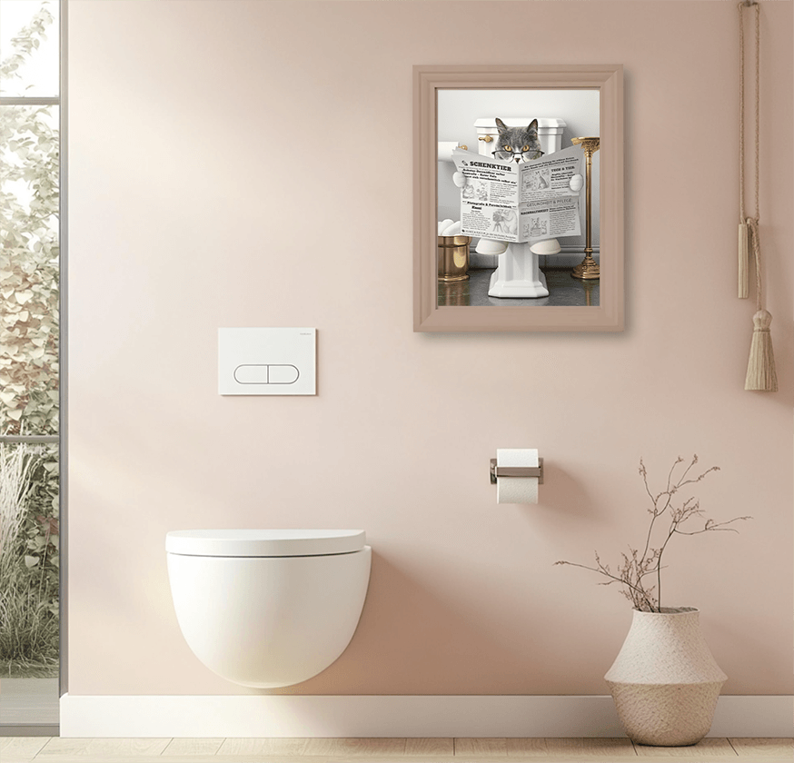 WC-Katzenposter mit Zeitung – Name & Charakter wählbar. Geschenkidee in 3 Größen.